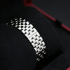 This is a 31mm X 42mm model that has a stainless steel bracelet, 7-sided crown with synthetic faceted blue spinel, a stunning white dial, roman numeral hour markers and sword-shaped hands.
