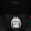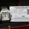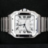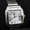 Here we have the Santos De Cartier– White Roman This is a 40mm large model that has a steel bracelet with SmartLink adjustment system, 7-sided crown with synthetic faceted blue spinel, a stunning white dial, roman numeral hour markers, a date window at 6 o’clock and polished steel sword-shaped hands.... Read More