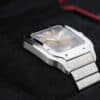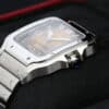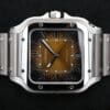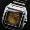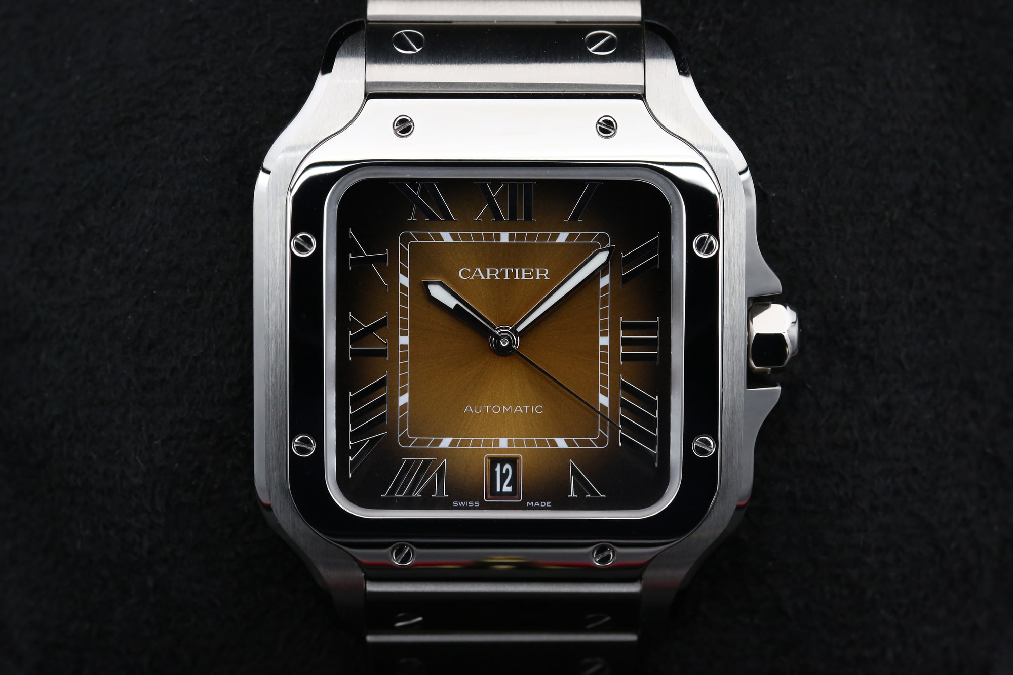 Santos de Cartier watch, large model, mechanical movement with automatic winding 1847 MC. Steel case, 7-sided crown with a synthetic faceted blue spinel, satin-finish gradated brown sunray-brushed dial, rhodium-finish polished steel sword-shaped hands with luminescent material, sapphire crystal. Steel bracelet with SmartLink adjustment system. Second strap in brown alligator leather, with interchangeable folding steel buckle. Both are fitted with the QuickSwitch interchangeable system. Case width: 39.8 mm, thickness: 9.38 mm. Water-resistant up to 10 bar (approx. 100 metres).