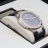THIS IS A 40MM MODEL THAT HAS A WHITE GOLD ROUNDED OCTAGONAL CASE, SAPPHIRE CRYSTAL GLASS AND A BEAUTIFUL GREY EMBOSSED DIAL.