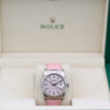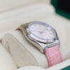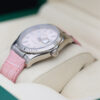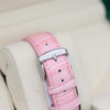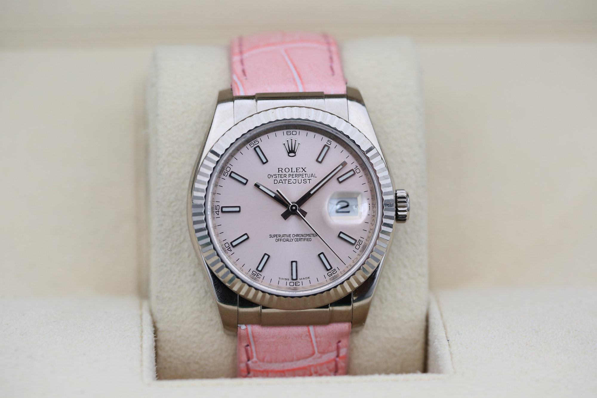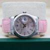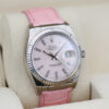 This is a 36mm model that features a 18ct white gold case, 18ct white gold fluted bezel, stylish pink dial, a date window at 3 o’clock, pink leather strap and contrasting white index hour markers.