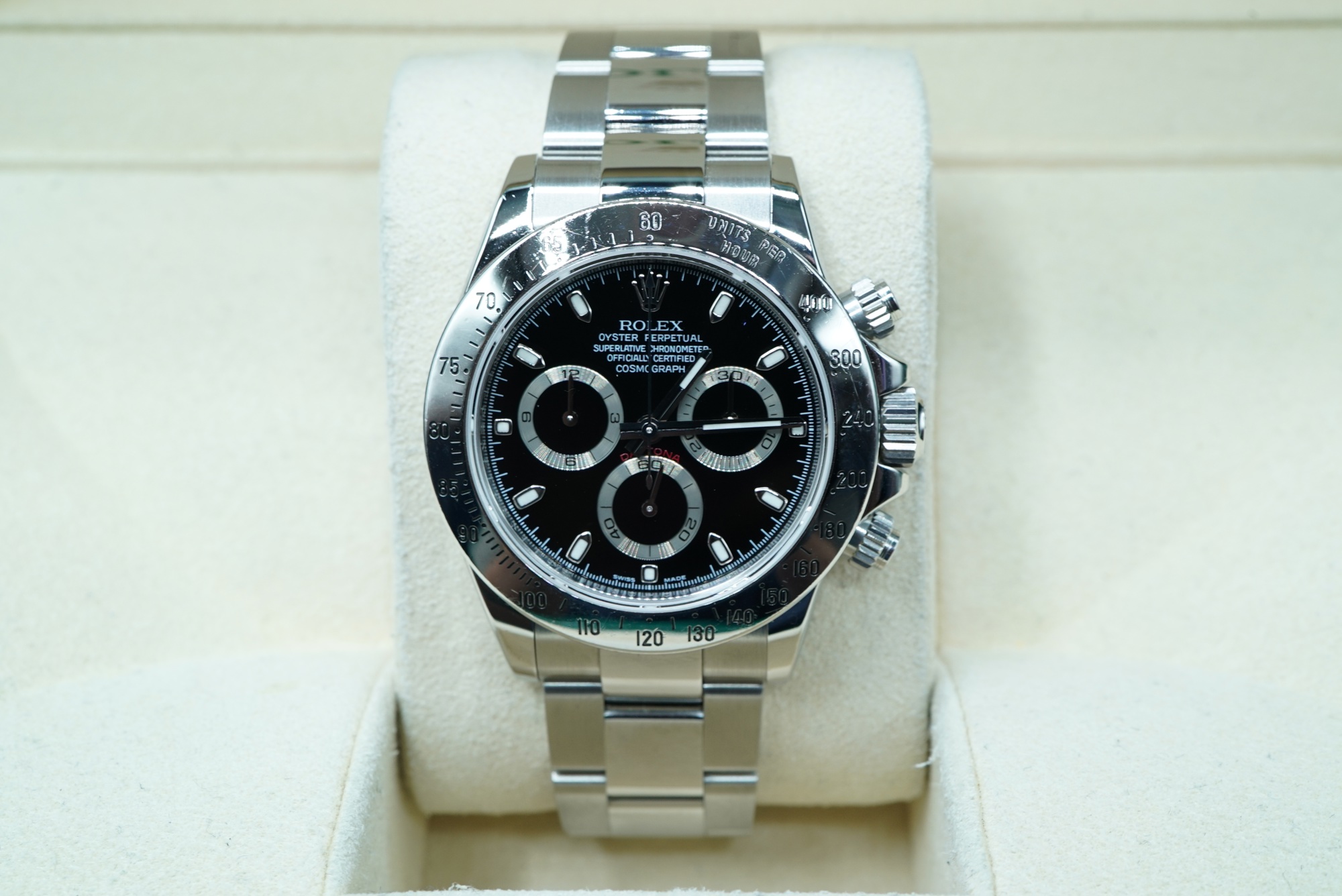 Brand: Rolex Model: Daytona Reference No: 116520 Case: Stainless Steel (SS) Bracelet: Oyster Size: 40 Dial: Black Bezel: Steel Year: 10/2009 Condition: Preowned Box papers: Complete Read More