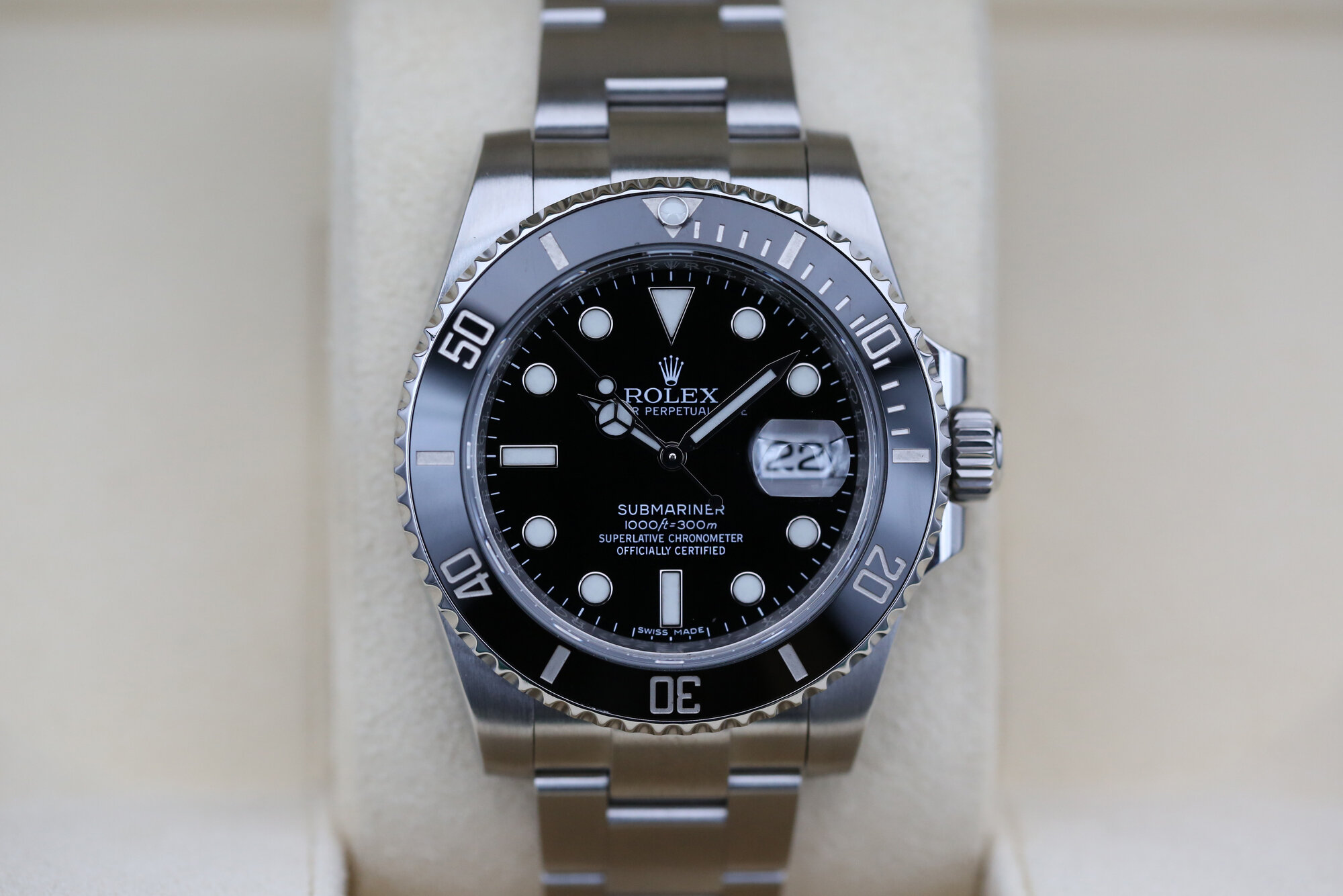 The Submariner boasts a 60-minute rotatable bezel that allow a diver to accurately and safely monitor diving time and decompression stops, it also provides a chromalight display making the hour markers and hands more visible in the dark.