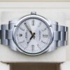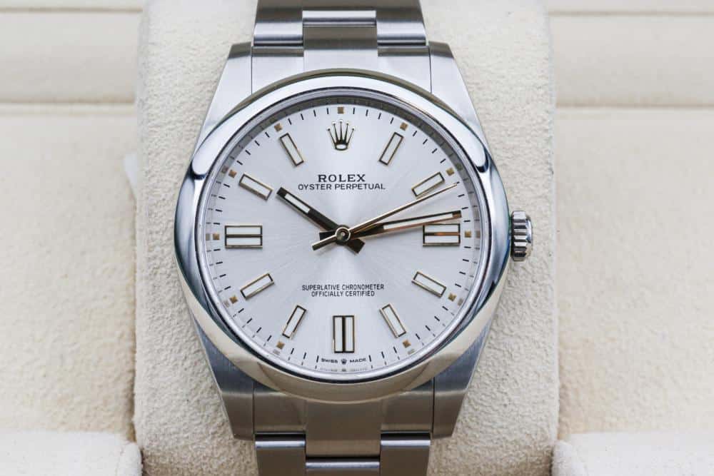 THIS IS A 41MM MODEL AND COMES ON THE FAMOUS OYSTER BRACELET WITH A STRIKING SILVER DIAL, THIS SUNRAY FINISH IS OBTAINED USING MASTERFUL BRUSHING TECHNIQUES THAT CREATE A CHARACTERISTIC SUBTLE GLOW THAT MOVES DEPENDING ON THE POSITION OF THE WRIST.