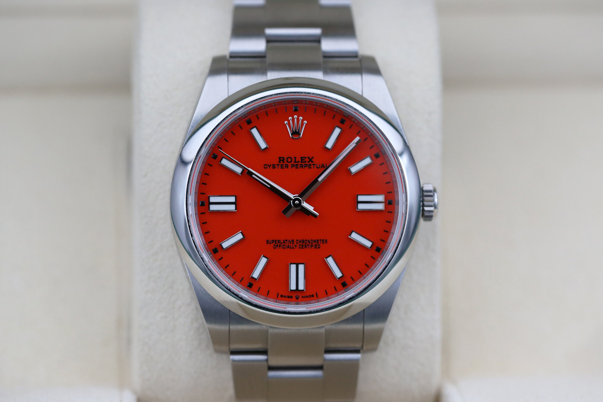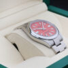 Here we have the Rolex Oyster Perpetual– Coral Red