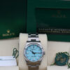 This is a 36mm model and comes on the famous oyster bracelet with a smooth oystersteel bezel and a striking turquoise blue dial, this beautiful dial is affectionately known in the industry as “The Tiffany dial”.