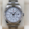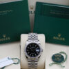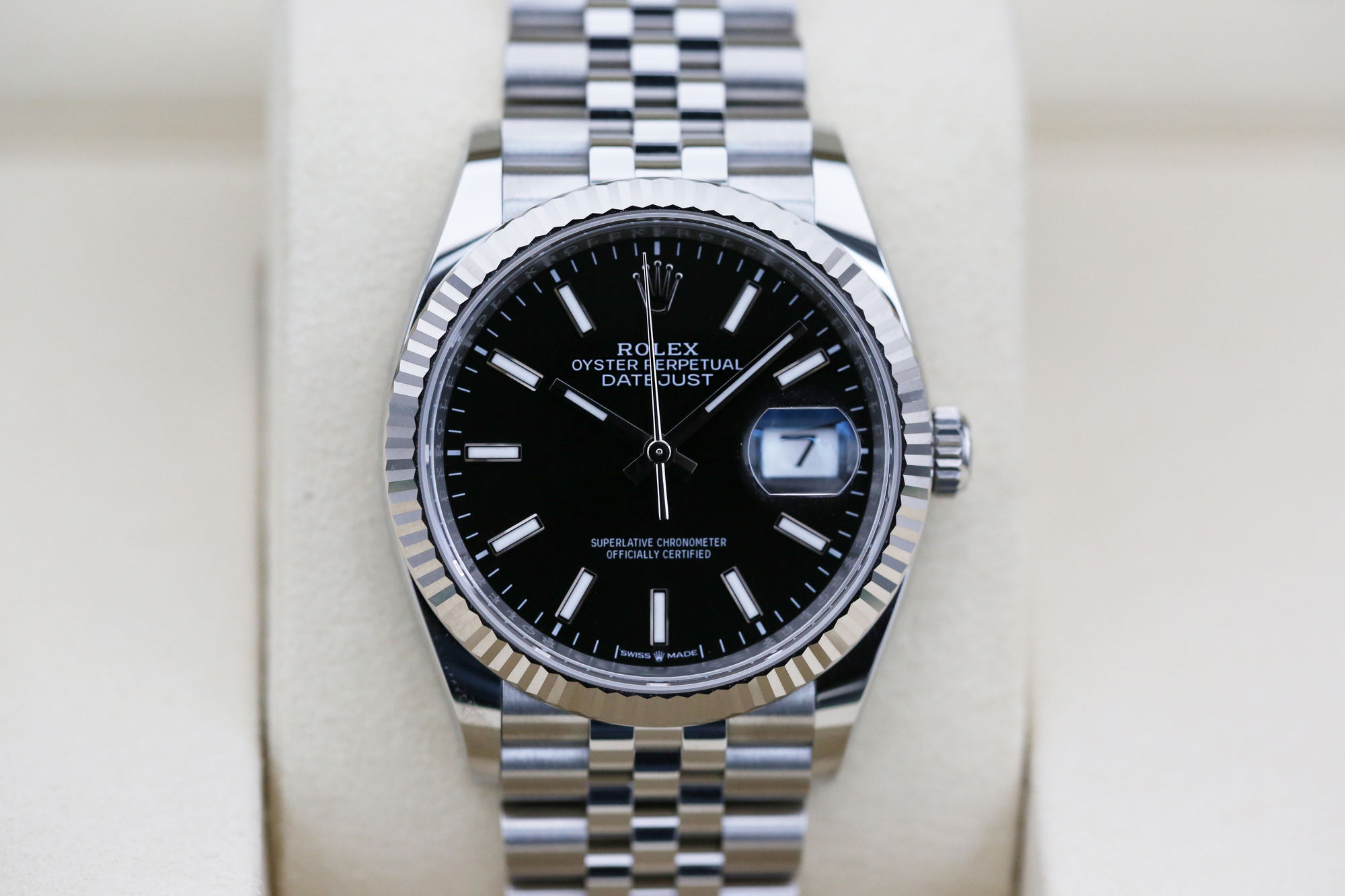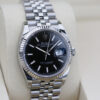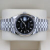 The watch is a beautiful combination of white gold and oystersteel that features a stylish black dial, a date window at 3 o’clock and a white gold fluted bezel.