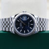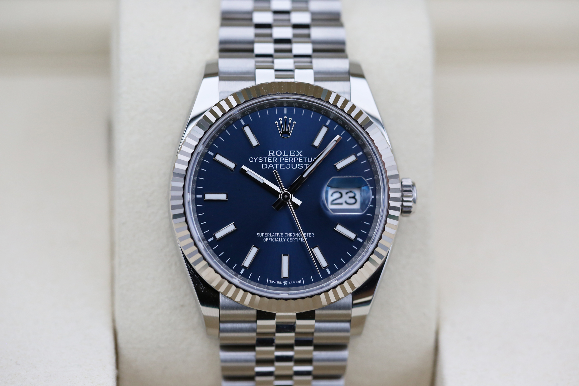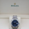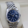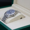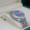 The watch is a beautiful combination of white gold and oystersteel that features a stunning blue dial, a date window at 3 o’clock and a white gold fluted bezel.