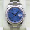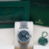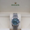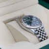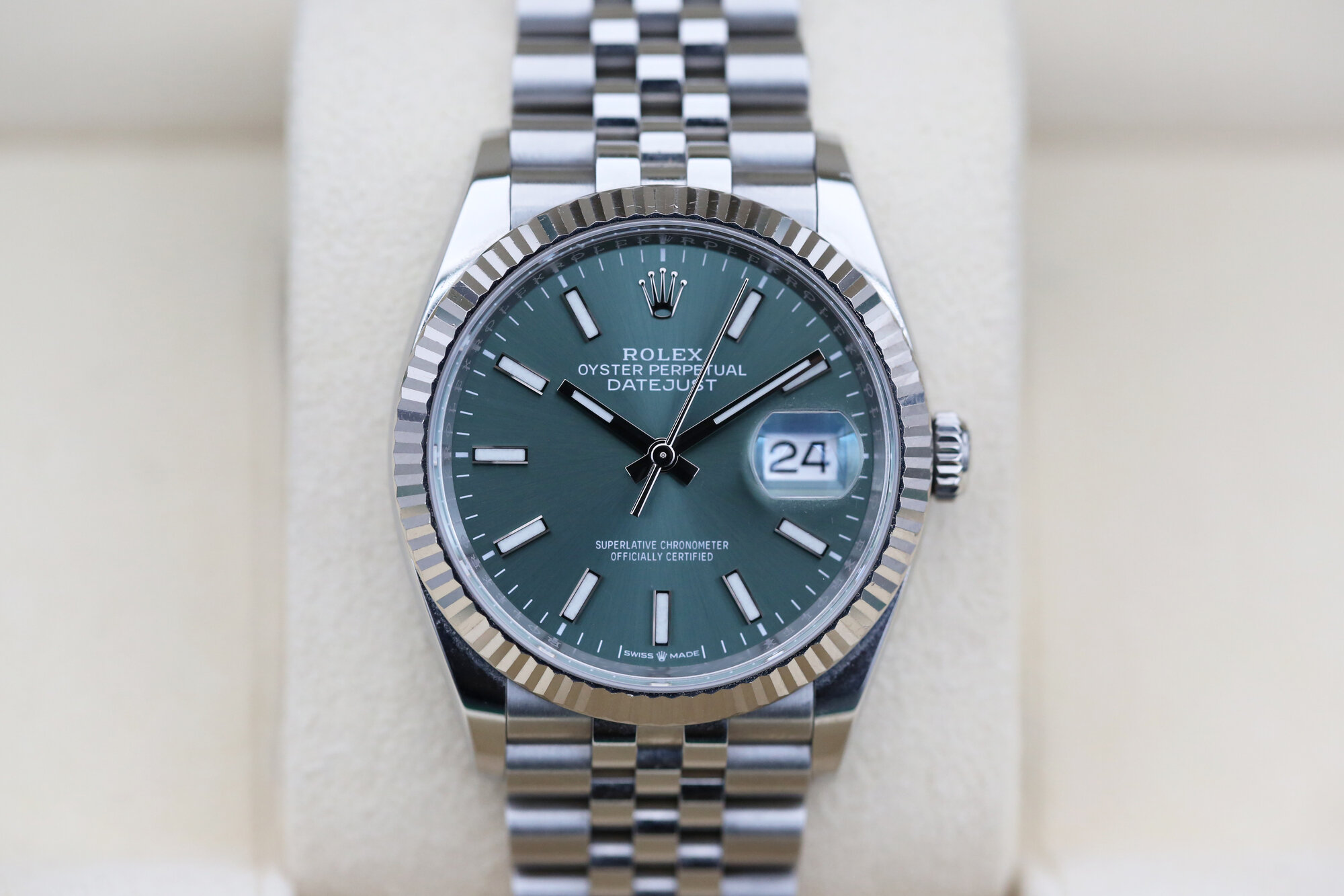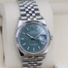 The watch is a beautiful combination of white gold and oystersteel that features a stunning mint green dial, a date window at 3 o’clock and a white gold fluted bezel.