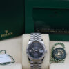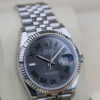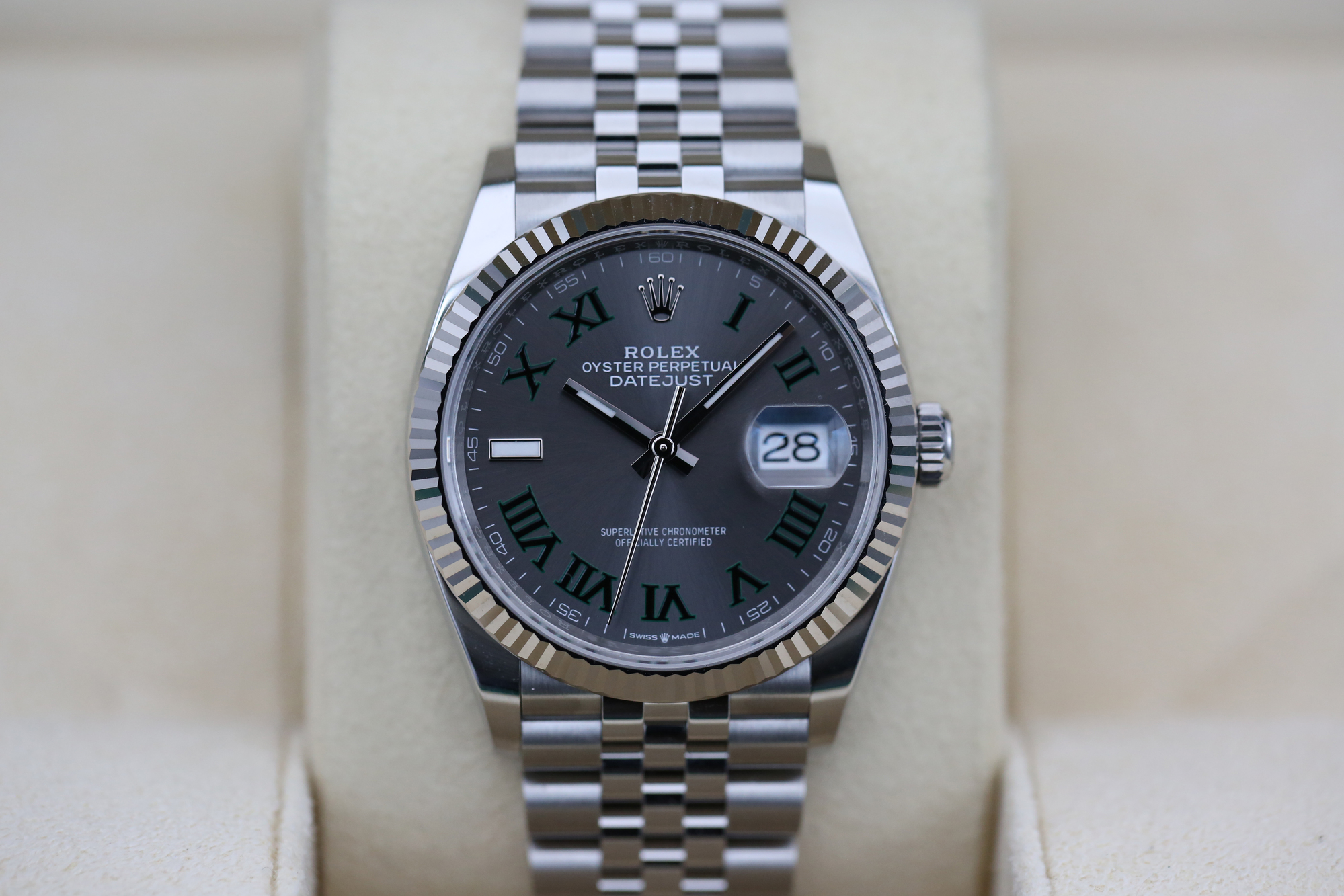 The watch is a combination of white gold and oystersteel that features a stunning slate dial with green outlined roman numeral hour markers, a date window at 3 o’clock and a white gold fluted bezel.