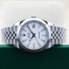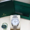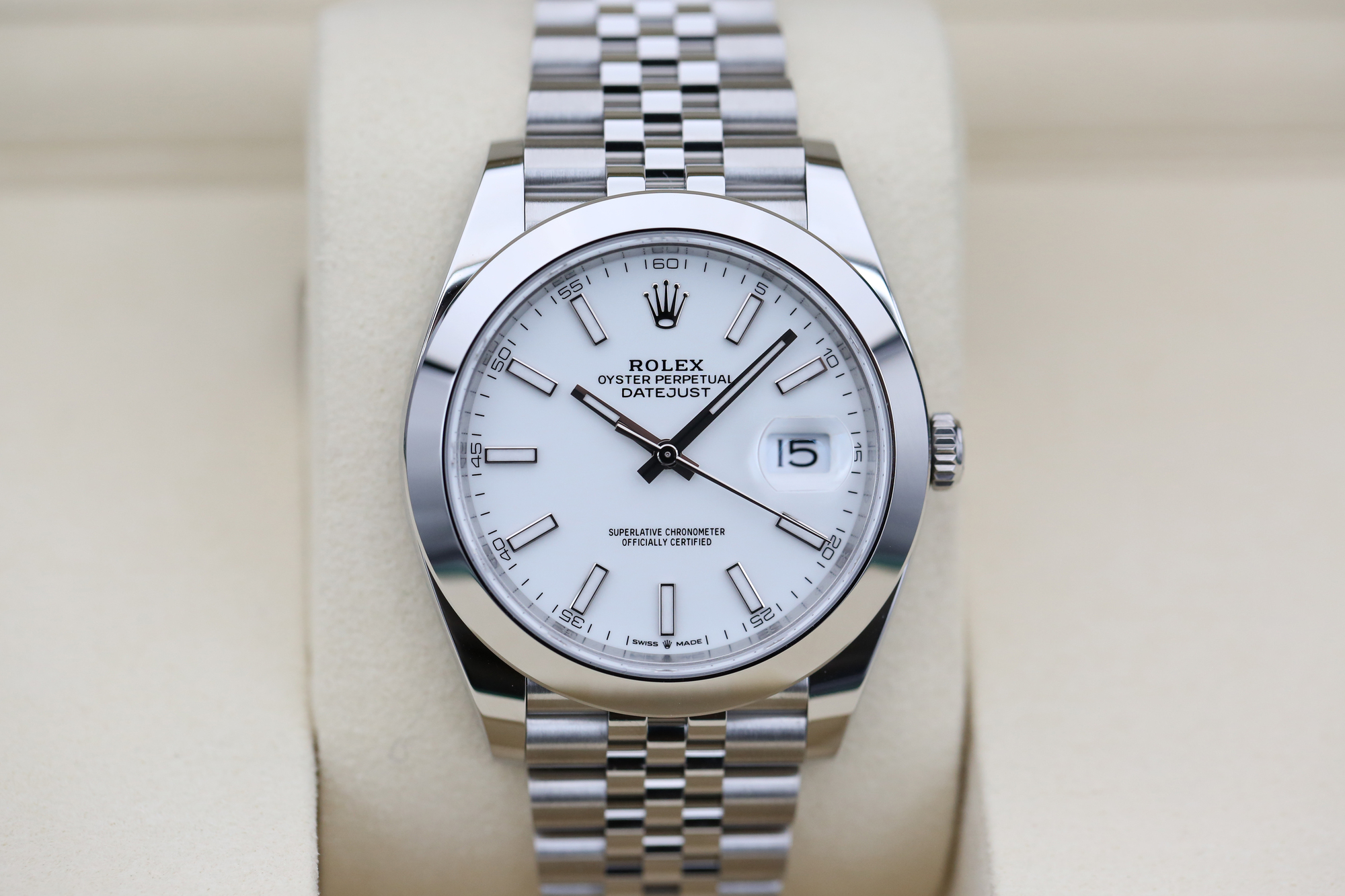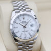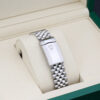 This watch features a stunning white dial, index hour markers, a date window at 3 o’clock and a smooth oystersteel bezel.