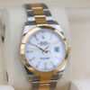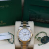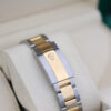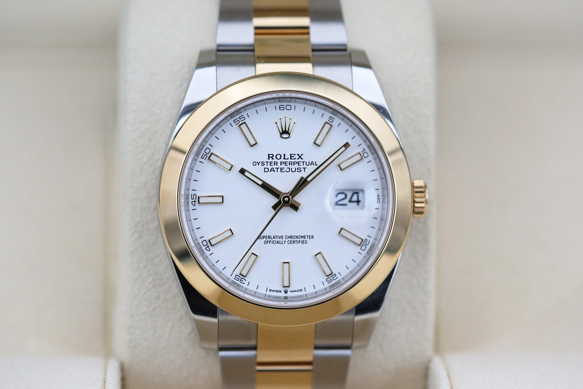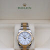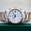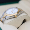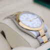 The watch is a combination of 18ct gold and oystersteel that features a stunning white dial with gold set index hour markers, a date window at 3 o’clock and a smooth 18ct gold bezel.