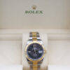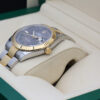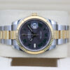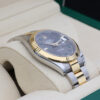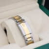 The watch is a combination of 18ct gold and oystersteel that features a stunning slate dial with green outlined roman numeral hour markers, a date window at 3 o’clock and a white gold fluted bezel.