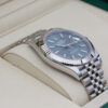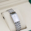 The watch is a beautiful combination of white gold and oystersteel that features a stunning mint green dial, a date window at 3 o’clock and a white gold fluted bezel.
