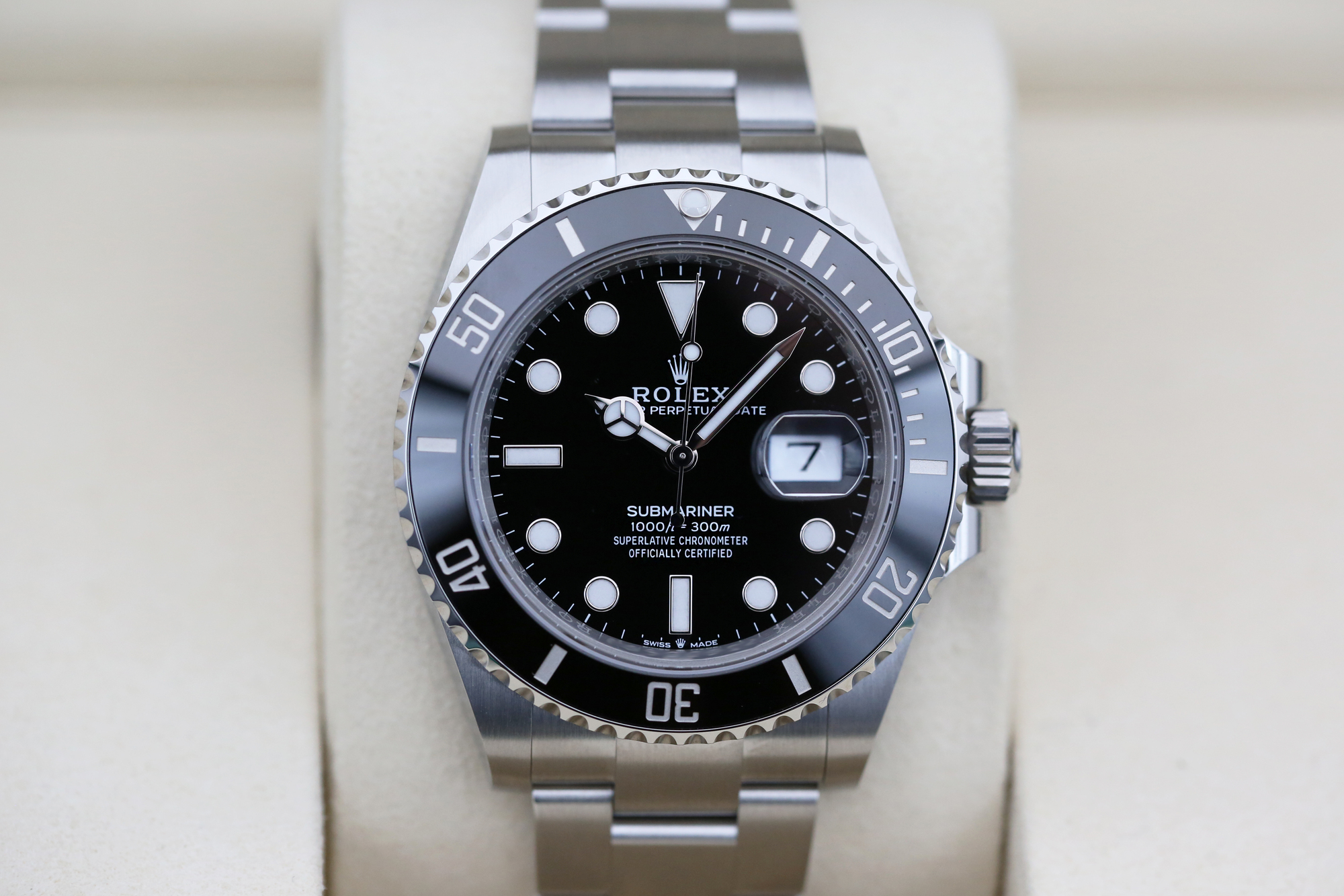 Here we have the Rolex Submariner–Black This is a 41mm model and comes on the famous oyster bracelet. This watch has a stylish black dial, date window at 3 o’clock and a cerachrom bezel with a black ceramic insert. The Submariner boasts a 60-minute rotatable bezel that allow a diver... Read More
