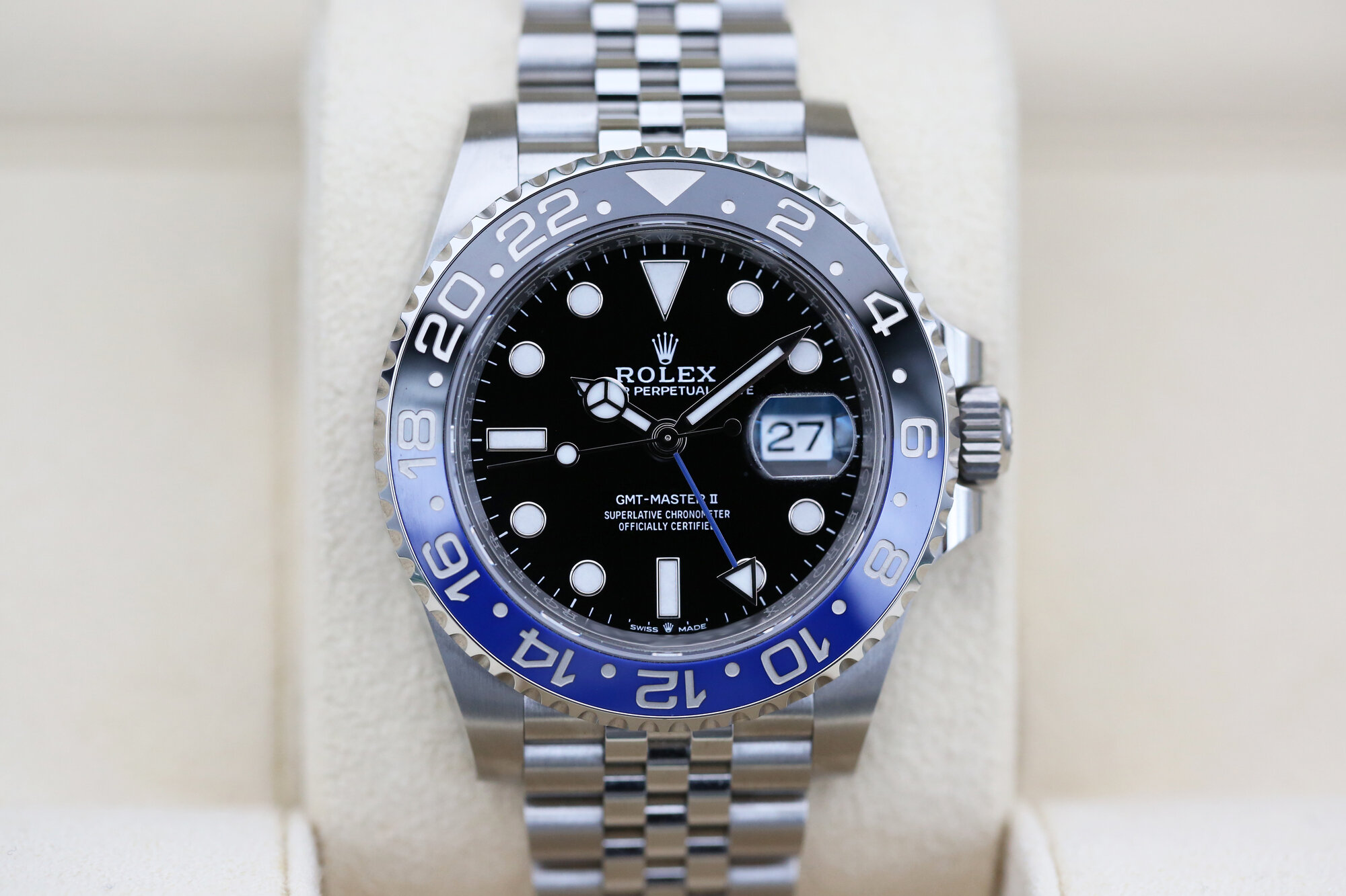 This watch features a stylish black dial and a cerachrom bezel with blue and black ceramic insert, this colour combination on the jubilee bracelet is affectionately known in the industry as “The Batgirl”.