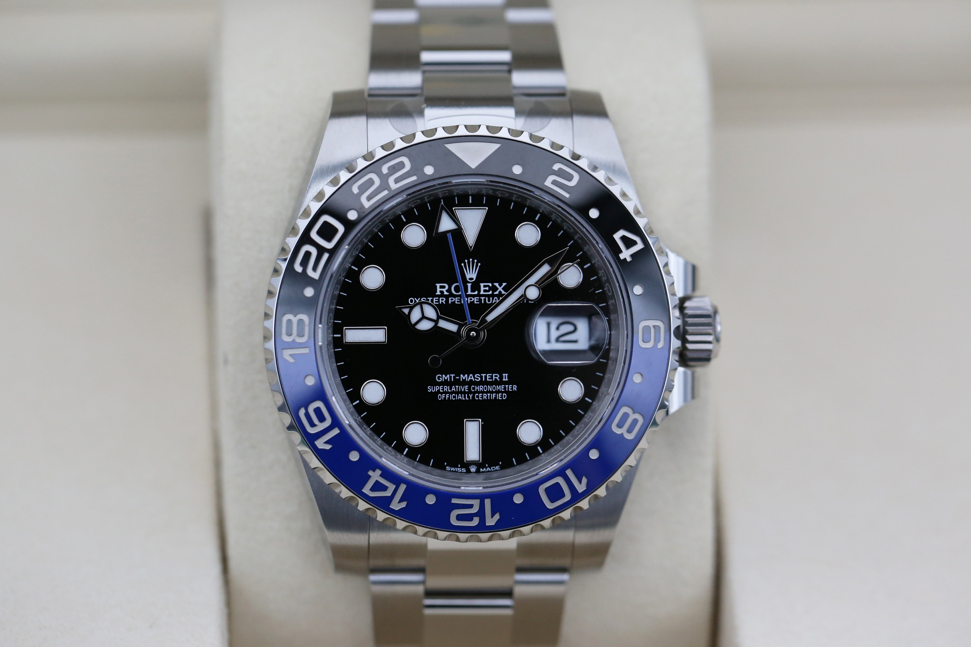 This watch features a stylish black dial and a cerachrom bezel with blue and black ceramic insert, this colour combination on the oyster bracelet is affectionately known in the industry as “The Batman”.