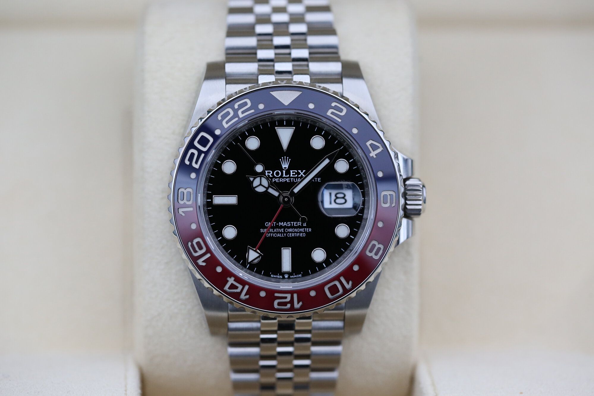 This watch features a stylish black dial and a cerachrom bezel with blue and red ceramic insert, this colour combination is affectionately known in the industry as “The Pepsi”.