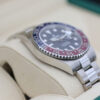 The GMT-Master II also boasts an arrow tipped hand which circles the dial once every 24 hours allowing the wearer to track another time zone on the 24 hour bezel, a date window at 3 o’clock and a chromalight display making the hour markers and hands more visible in the dark.