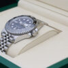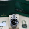 The GMT-Master II also boasts an arrow tipped hand which circles the dial once every 24 hours allowing the wearer to track another time zone on the 24 hour bezel, a date window at 3 o’clock and a chromalight display making the hour markers and hands more visible in the dark.