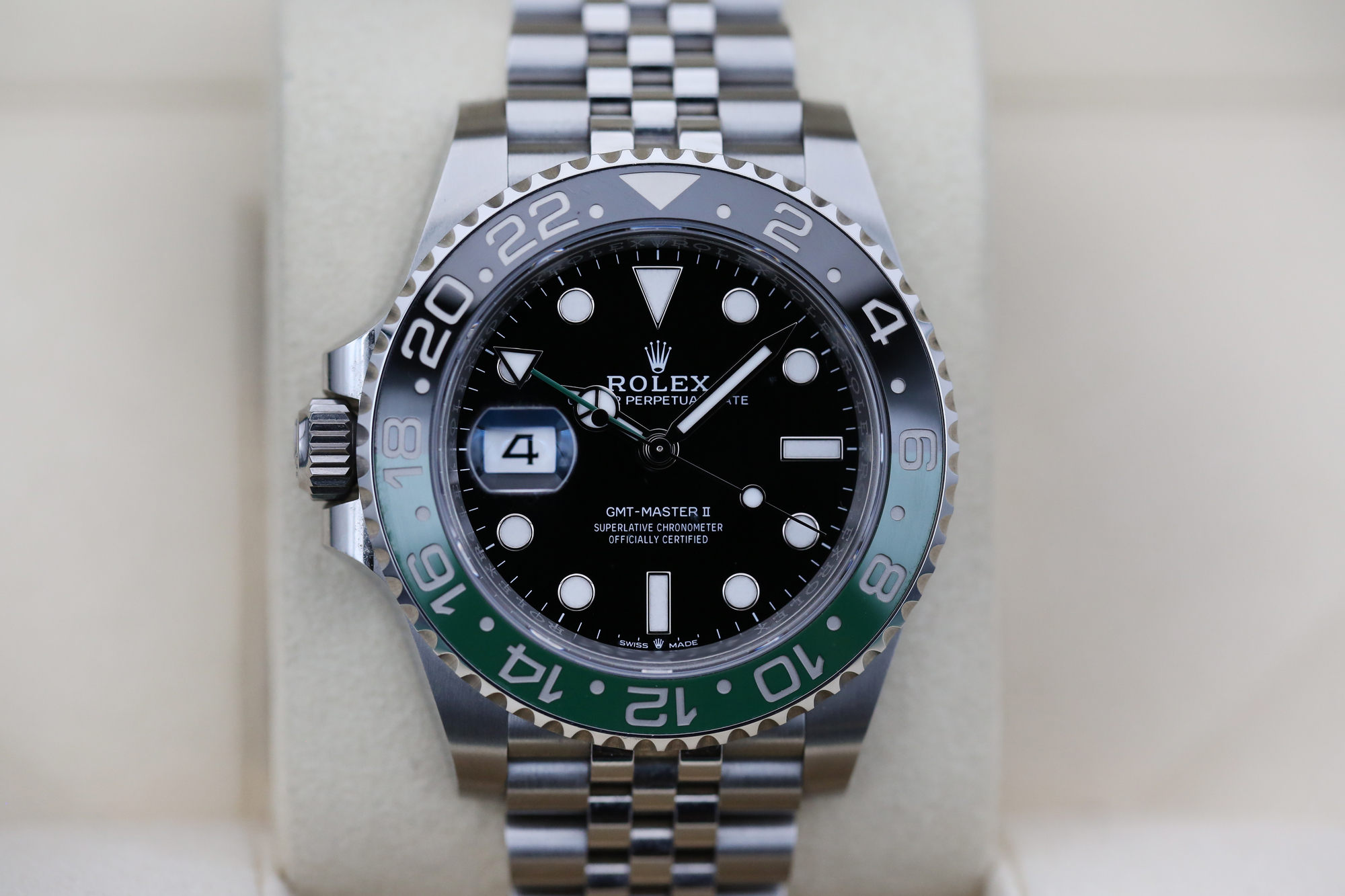 The GMT-Master II also boasts an arrow tipped hand which circles the dial once every 24 hours allowing the wearer to track another time zone on the 24 hour bezel and has a chromalight display making the hour markers and hands more visible in the dark.