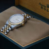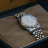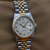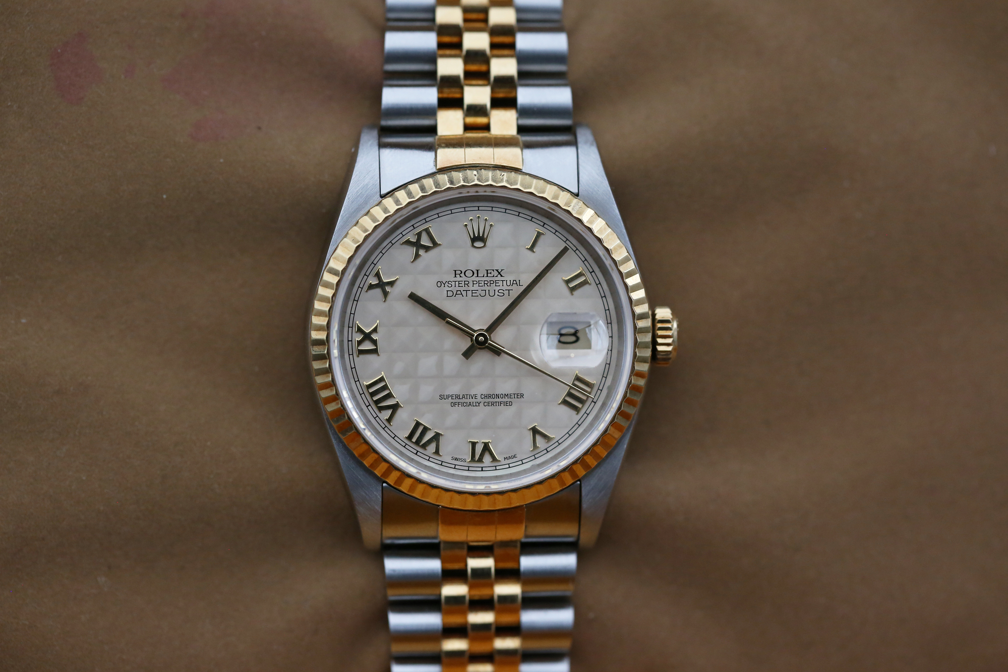 This watch is a beautiful combination of 18ct gold and oystersteel that features a stunning pyramid dial, roman numerals hour markers and a 18ct gold fluted bezel.