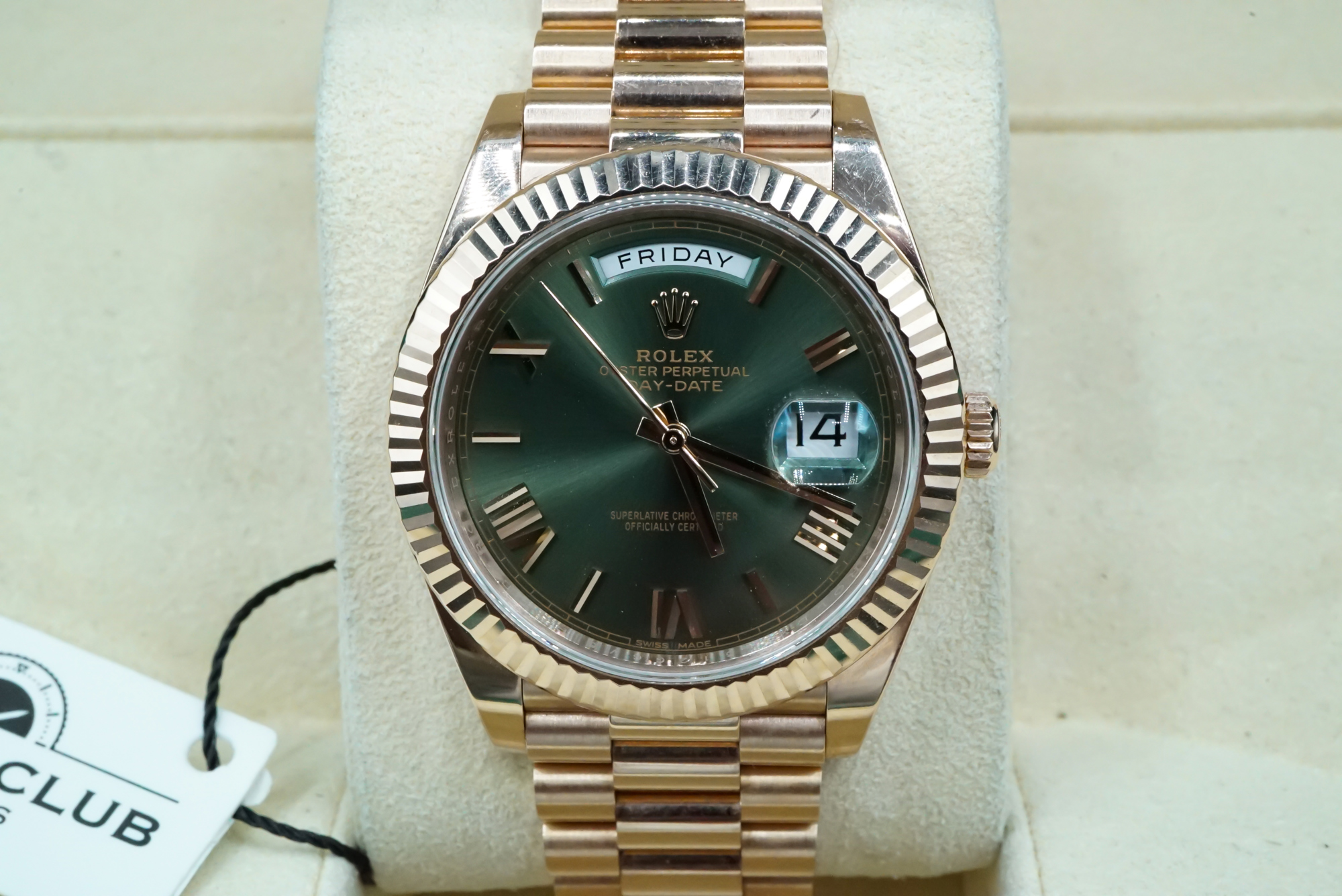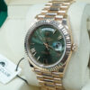 Brand: Rolex Model: Day Date Reference No: 228235 Case: Rose Gold (RG) Bracelet: Presidential Size: 40 Dial: Olive Bezel: Fluted Year: 2018 Condition: Preowned Box papers: Paperwork/Box Read More