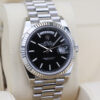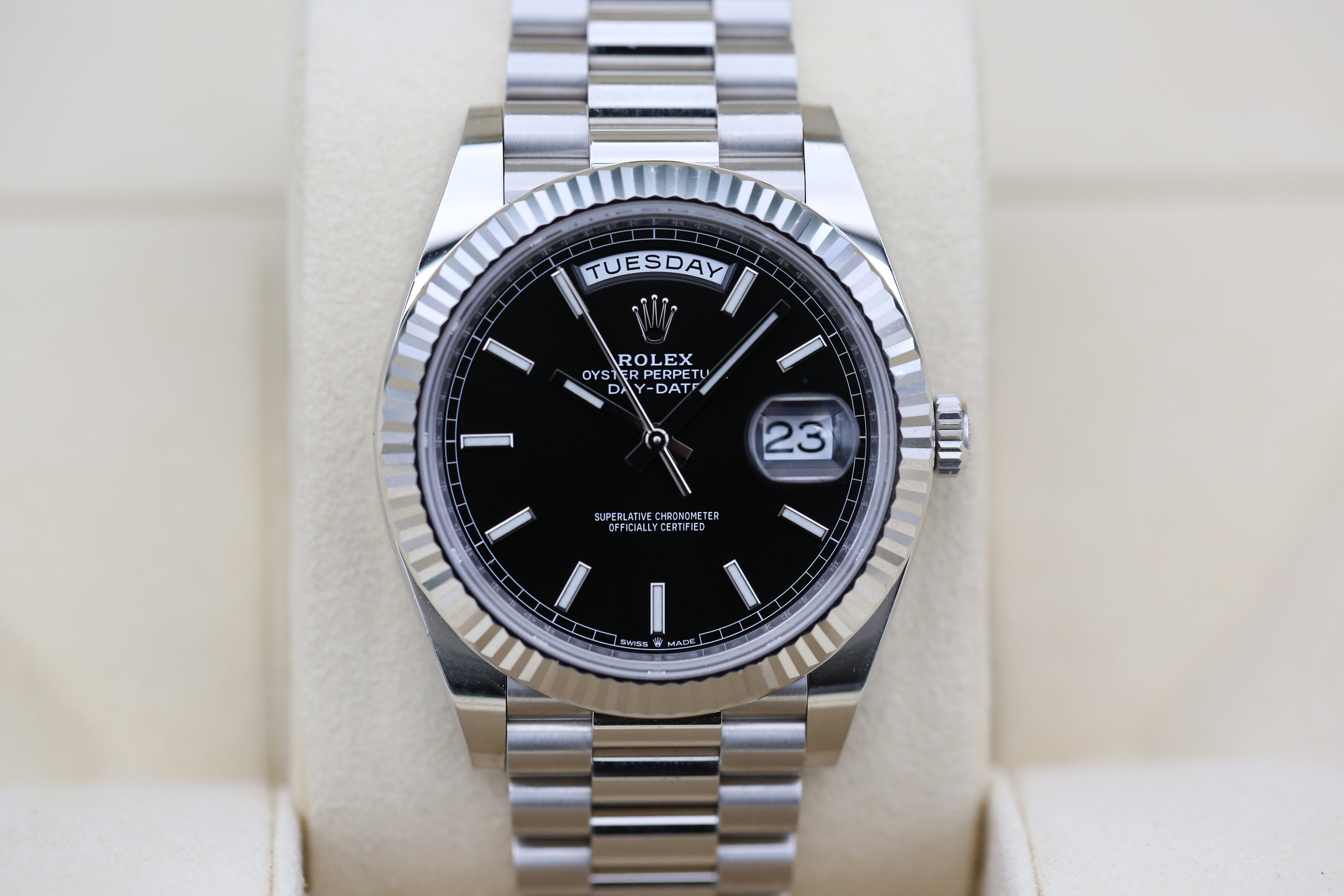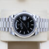 It boasts a stylish black dial, contrasting white index hour markers, day window at 12 o’clock, date window at 3’oclock and a fluted bezel