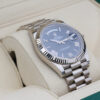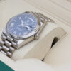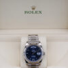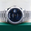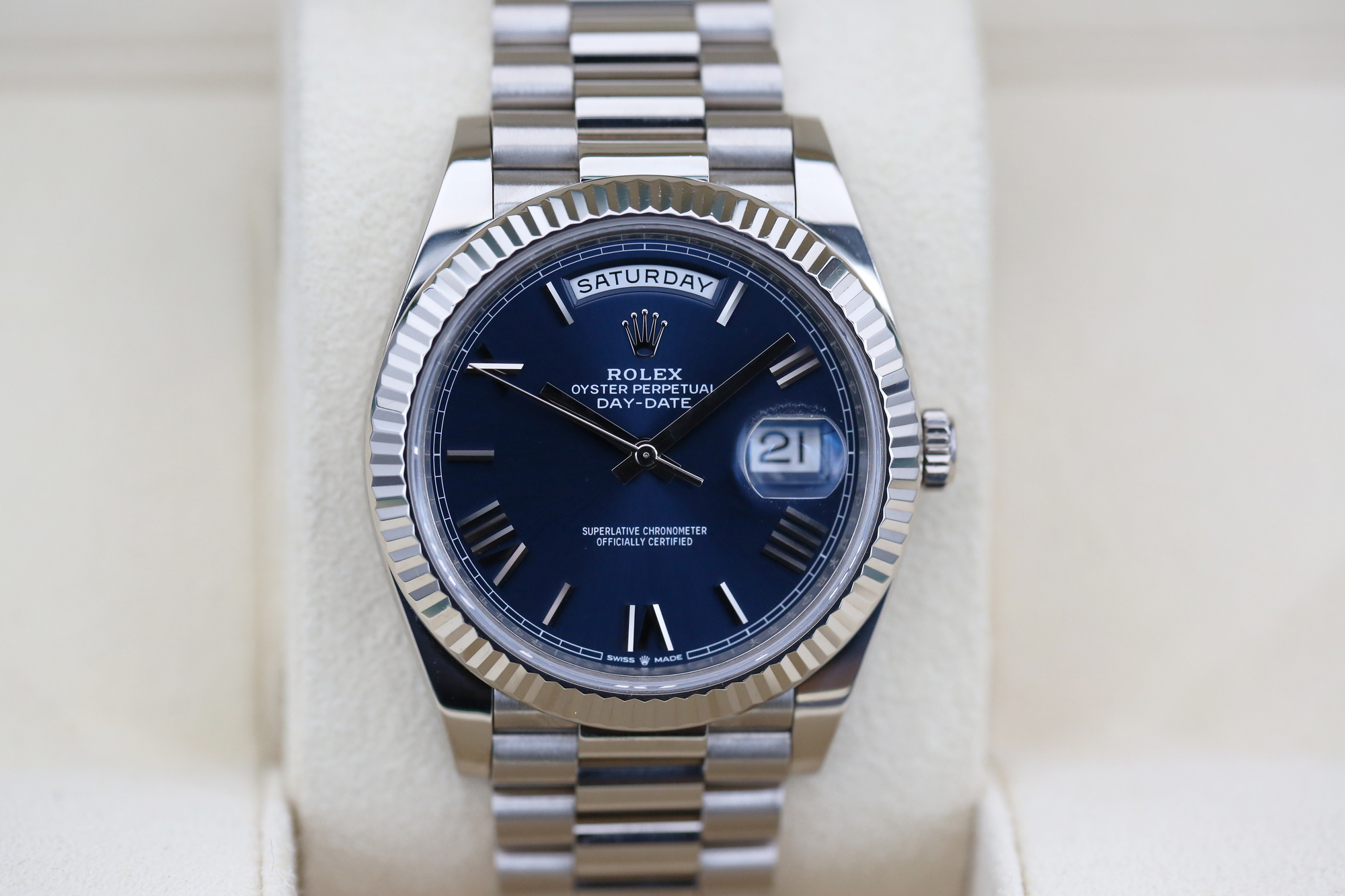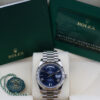 It boasts a stunning blue dial, roman numeral hour markers, day window at 12 o’clock, date window at 3’oclock and a fluted bezel