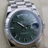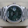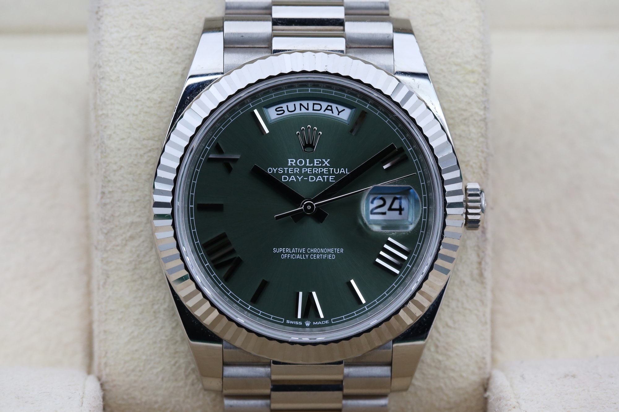WELCOME TO KETTLE CLUB WATCHES, HERE WE HAVE A ROLEX DAY DATE 40 WITH OLIVE GREEN DIAL STRIKING OLIVE GREEN DIAL, THE MOST SOUGHT AFTER DIAL IN THE white GoLD COLLECTION. THE WATCH HAS A 40MM CASE, COMPLETE WITH A white GOLD FLUTTED BEZEL. DATE WINDOW AT 3 O’CLOCK AND DAY WINDOW AT 12 O’CLOCK.