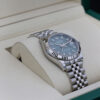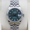 The watch is a beautiful combination of white gold and oystersteel that features a stunning mint green dial, a date window at 3 o’clock and a white gold fluted bezel.