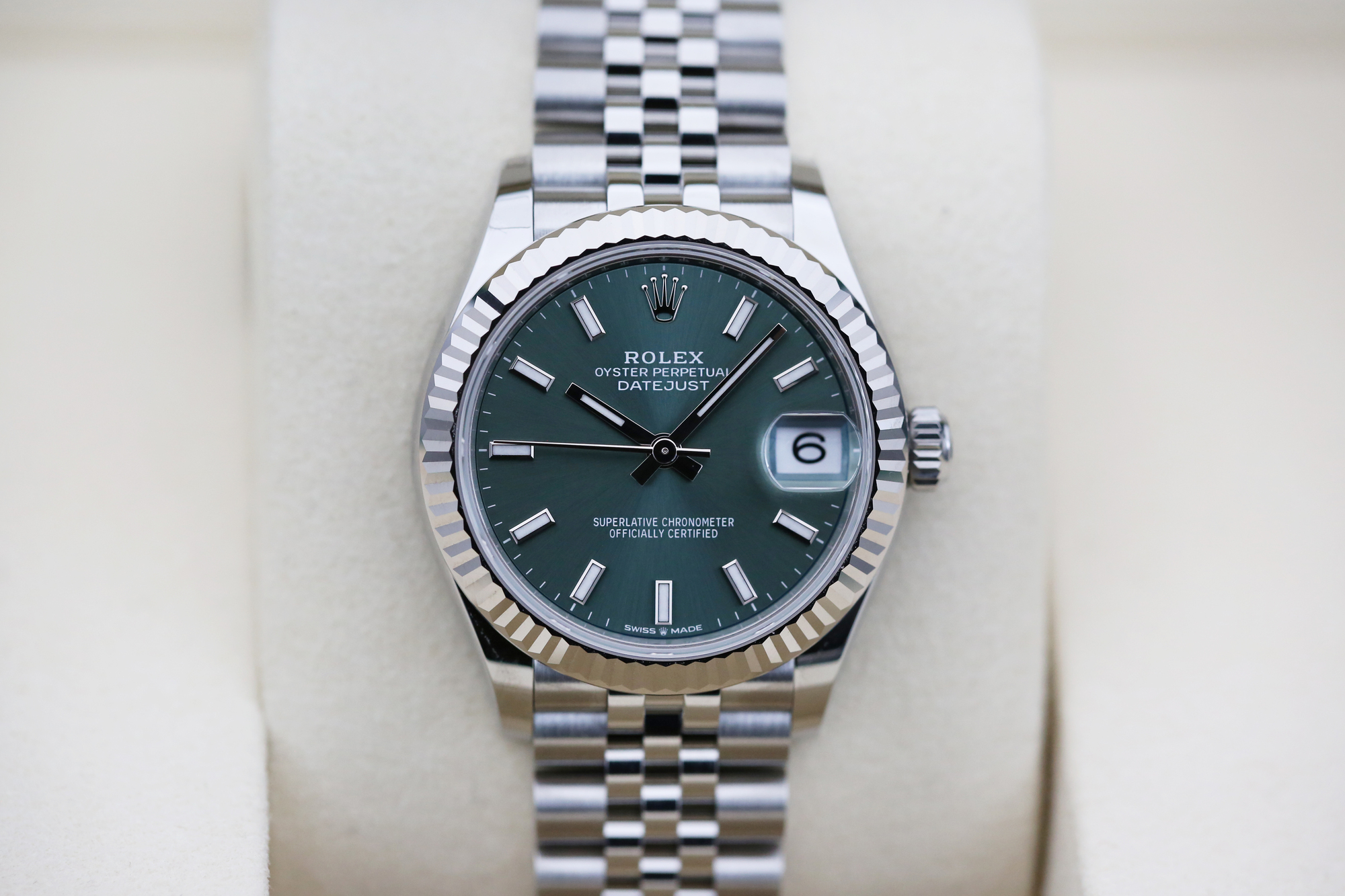 Here we have the Rolex Datejust- Mint Green This is a 31mm model and comes on the famous jubilee bracelet. The watch is a beautiful combination of white gold and oystersteel that features a stunning mint green dial, a date window at 3 o’clock and a white gold fluted bezel.... Read More