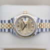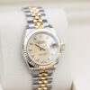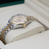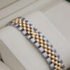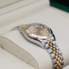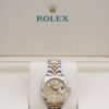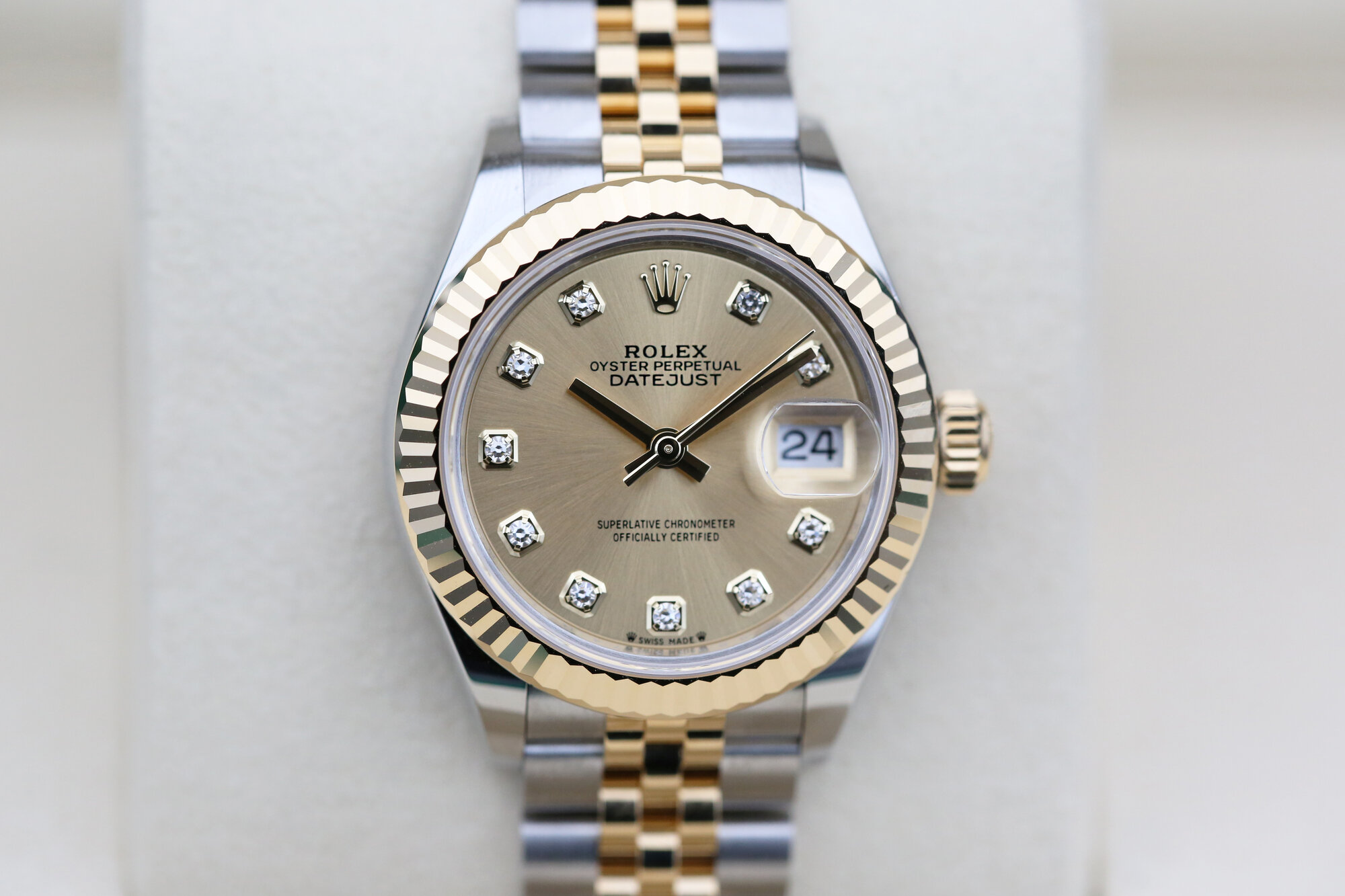 The watch is a beautiful combination of 18ct gold and oystersteel that features a stunning champagne dial, a date window at 3 o’clock, diamond hour markers and a 18ct gold fluted bezel.