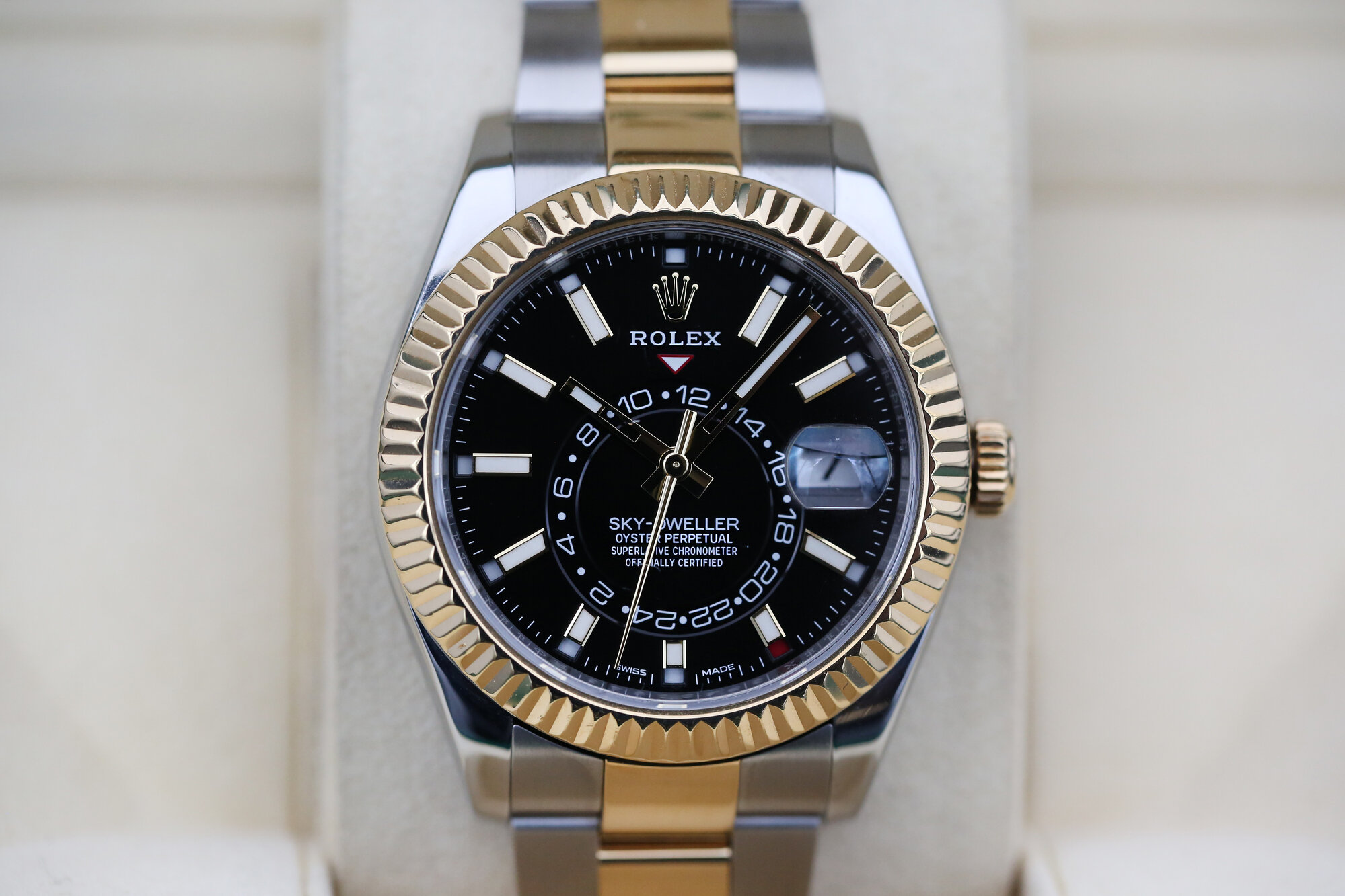 Here we have the Rolex Sky-Dweller–Black This is a 42mm model and comes on the famous jubilee bracelet. This watch boasts a stylish black dial, fluted bezel and is a beautiful combination of 18ct gold and oystersteel. The sky dweller has a fixed inverted red triangle pointing to an off-centre... Read More