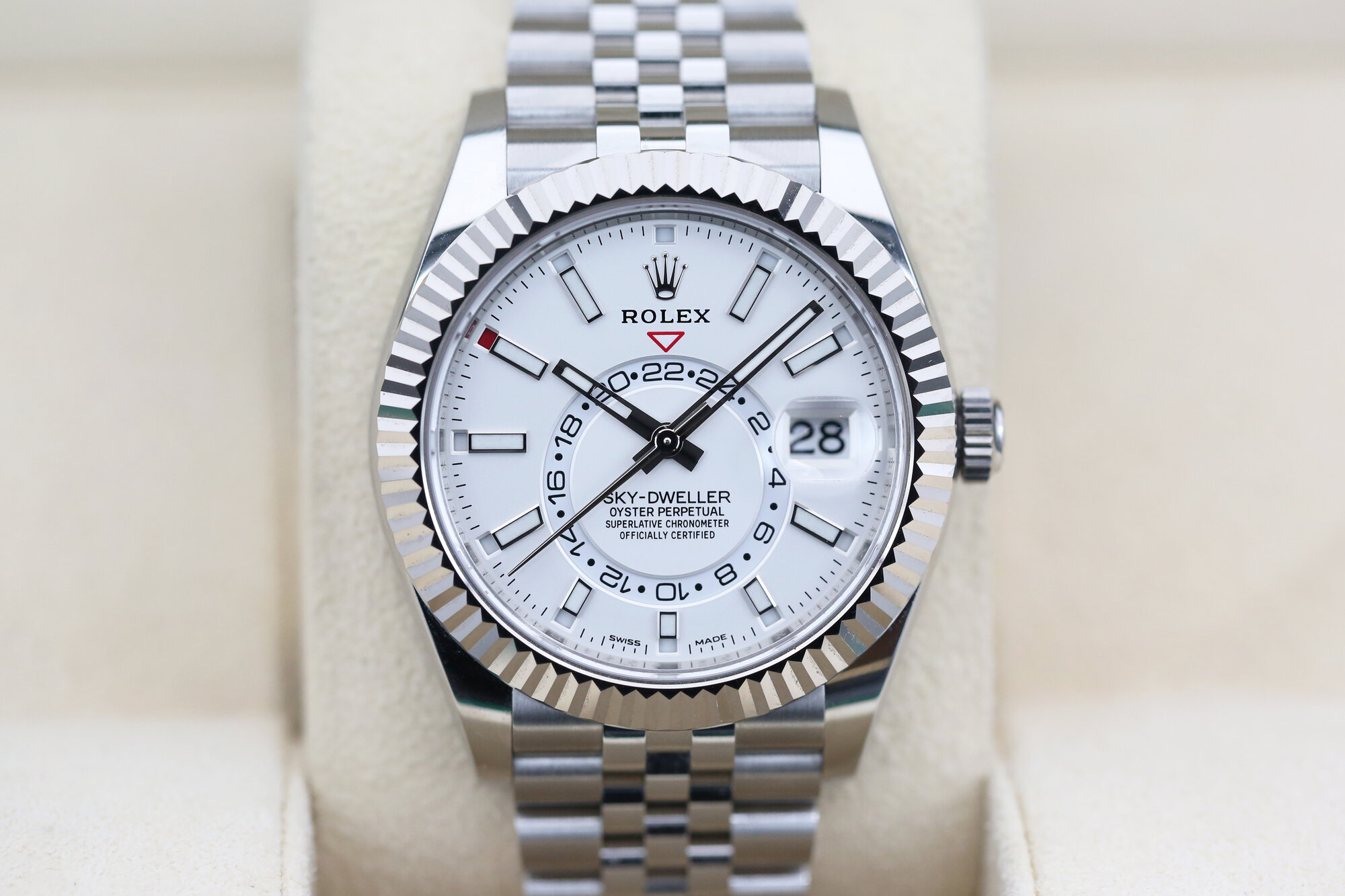 Here we have the Rolex Sky-Dweller– White This is a 42mm model and comes on the famous jubilee bracelet, it boasts a stunning white dial and a 18ct white gold fluted bezel. The sky-dweller has a fixed inverted red triangle pointing to an off-centre 24-hour disc that allows a traveller... Read More