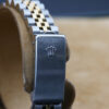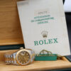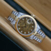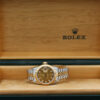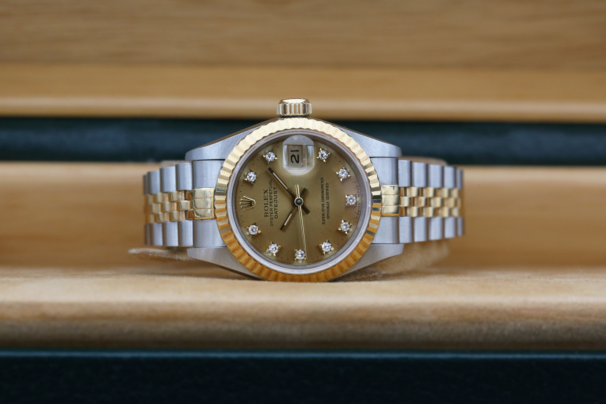 The watch is a beautiful combination of 18ct gold and oystersteel that features a stunning champagne dial, a date window at 3 o’clock, diamond hour markers and a 18ct gold fluted bezel.