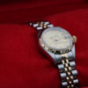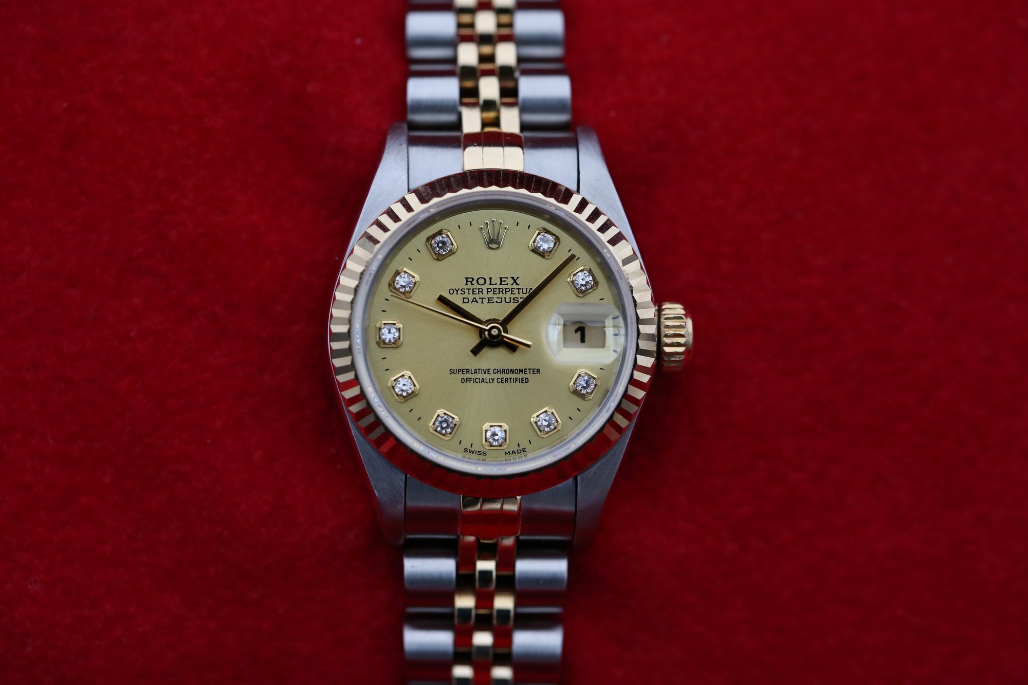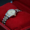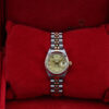 The watch is a beautiful combination of 18ct gold and oystersteel that features a stunning champagne dial, a date window at 3 o’clock, diamond hour markers and a 18ct gold fluted bezel.