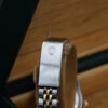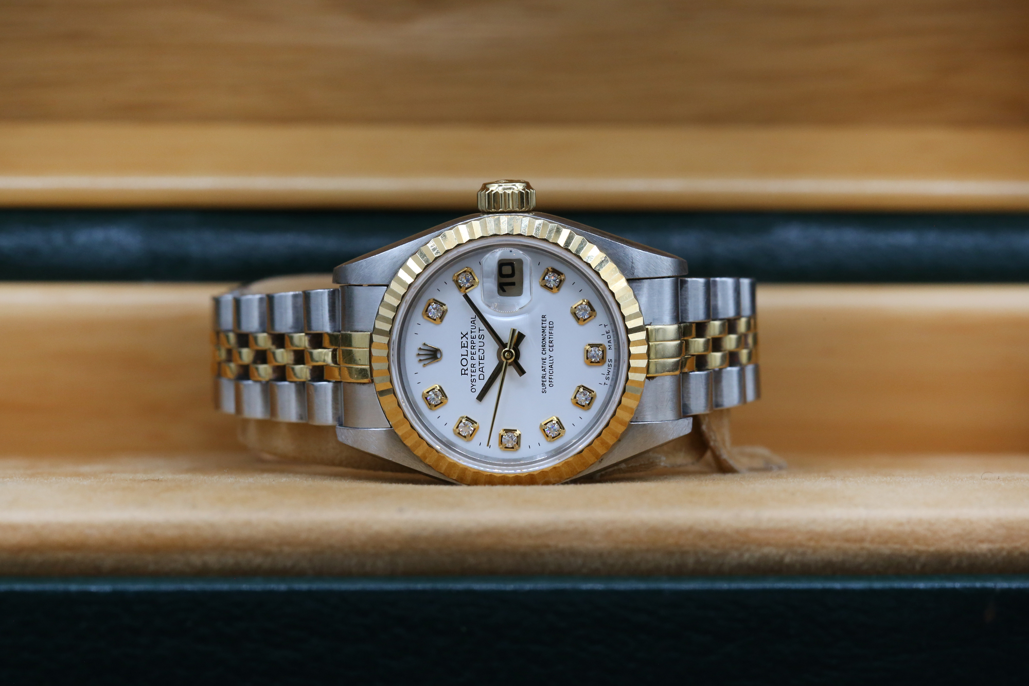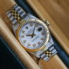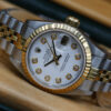 The watch is a beautiful combination of 18ct gold and oystersteel that features a stunning white dial, a date window at 3 o’clock, diamond hour markers and a 18ct gold fluted bezel.