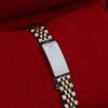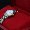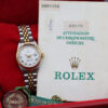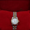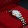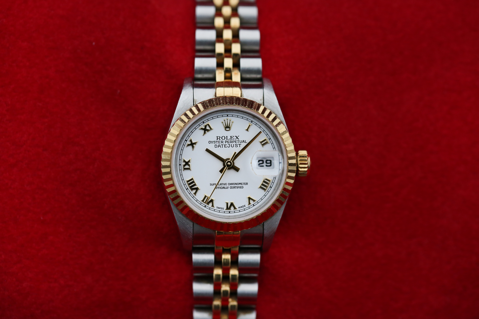 The watch is a beautiful combination of 18ct gold and oystersteel that features a stunning white dial, a date window at 3 o’clock, roman numeral hour markers and a 18ct gold fluted bezel.