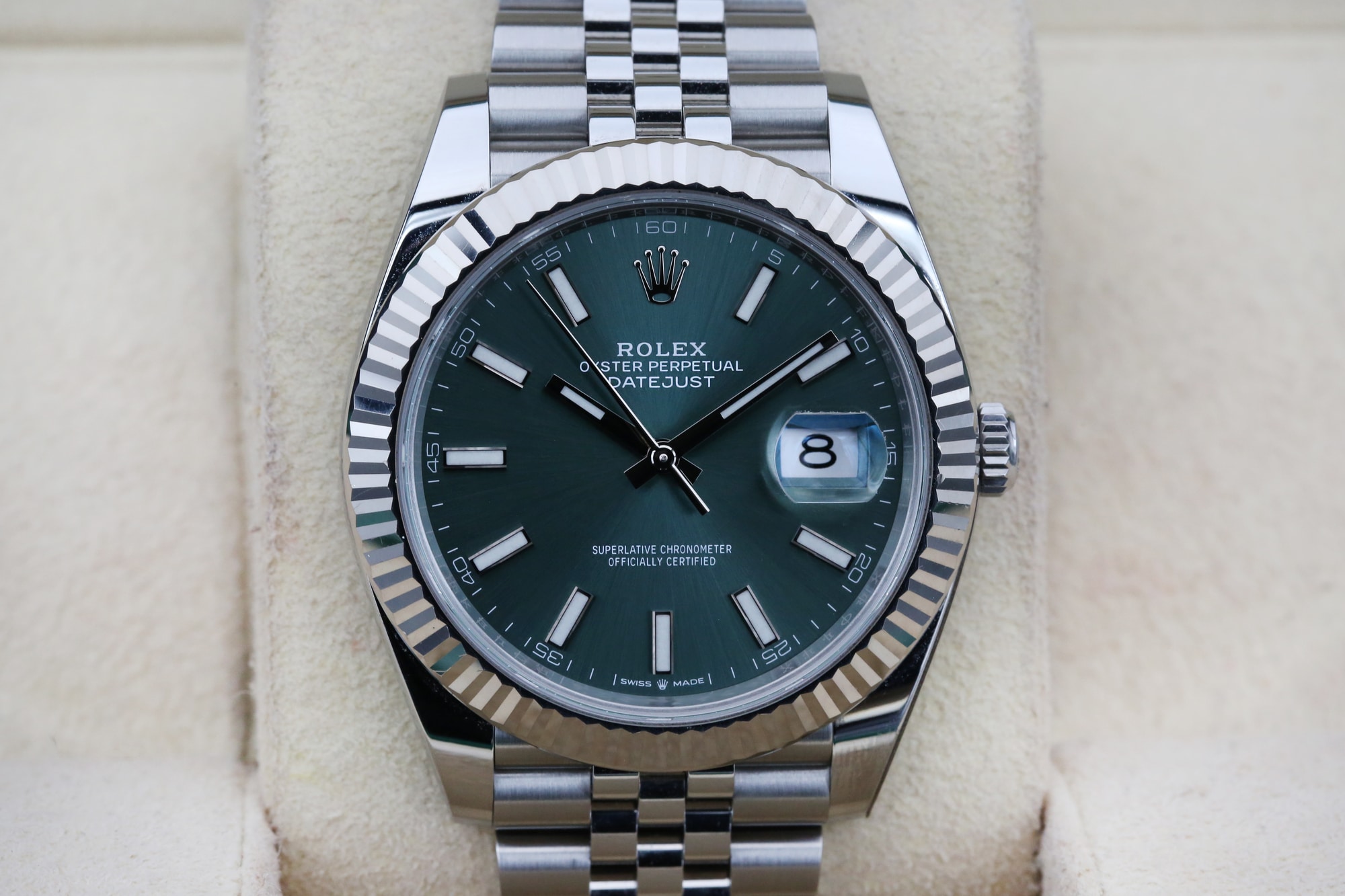 WELCOME TO KETTLE CLUB WATCHES, HERE WE HAVE A ROLEX DATEJUST 41MM 126334 MODEL BEAUTIFUL mint gree DIAL. THE WATCH HAS A 41MM CASE, CRAFTED FROM OYSTERSTEEL AND COMPLETE WITH A WHITE GOLD FLUTTED BEZEL. DATE WINDOW AT 3 O’CLOCK. THE WATCH COMES WITH THE JUBILEE BRACELET. WHICH IS POSSIBLY THE MOST RECOGNISABLE BRECELET IN THE WORLD. THE DATEJUST MODEL WAS FIRST INTRODCUED BY ROLEX IN 1945.