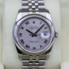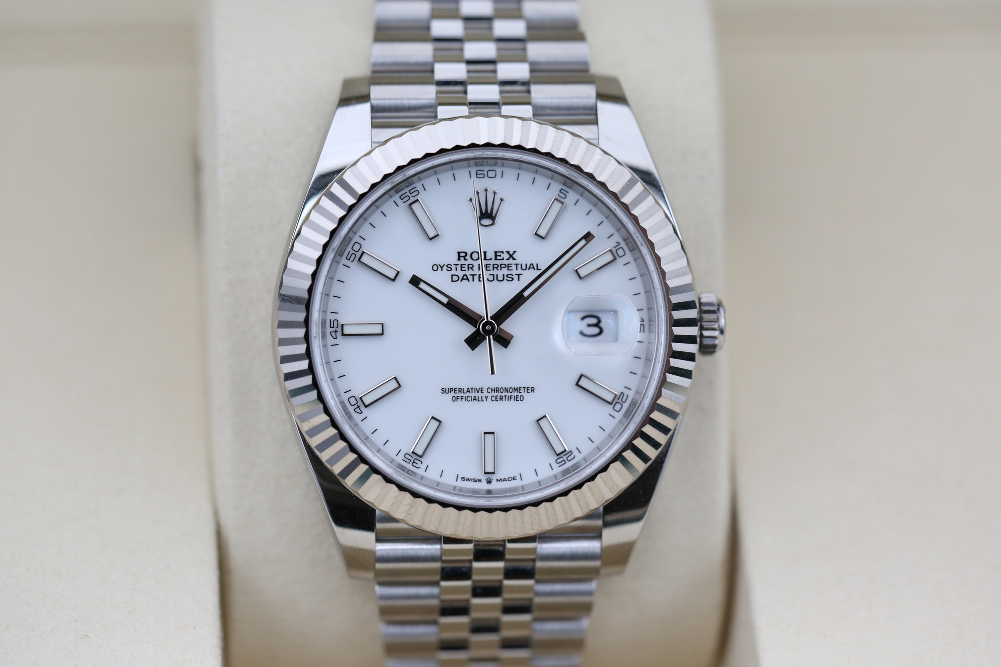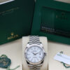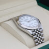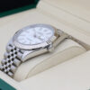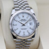 The watch is a beautiful combination of white gold and oystersteel that features a stunning white dial, a date window at 3 o’clock and a white gold fluted bezel.