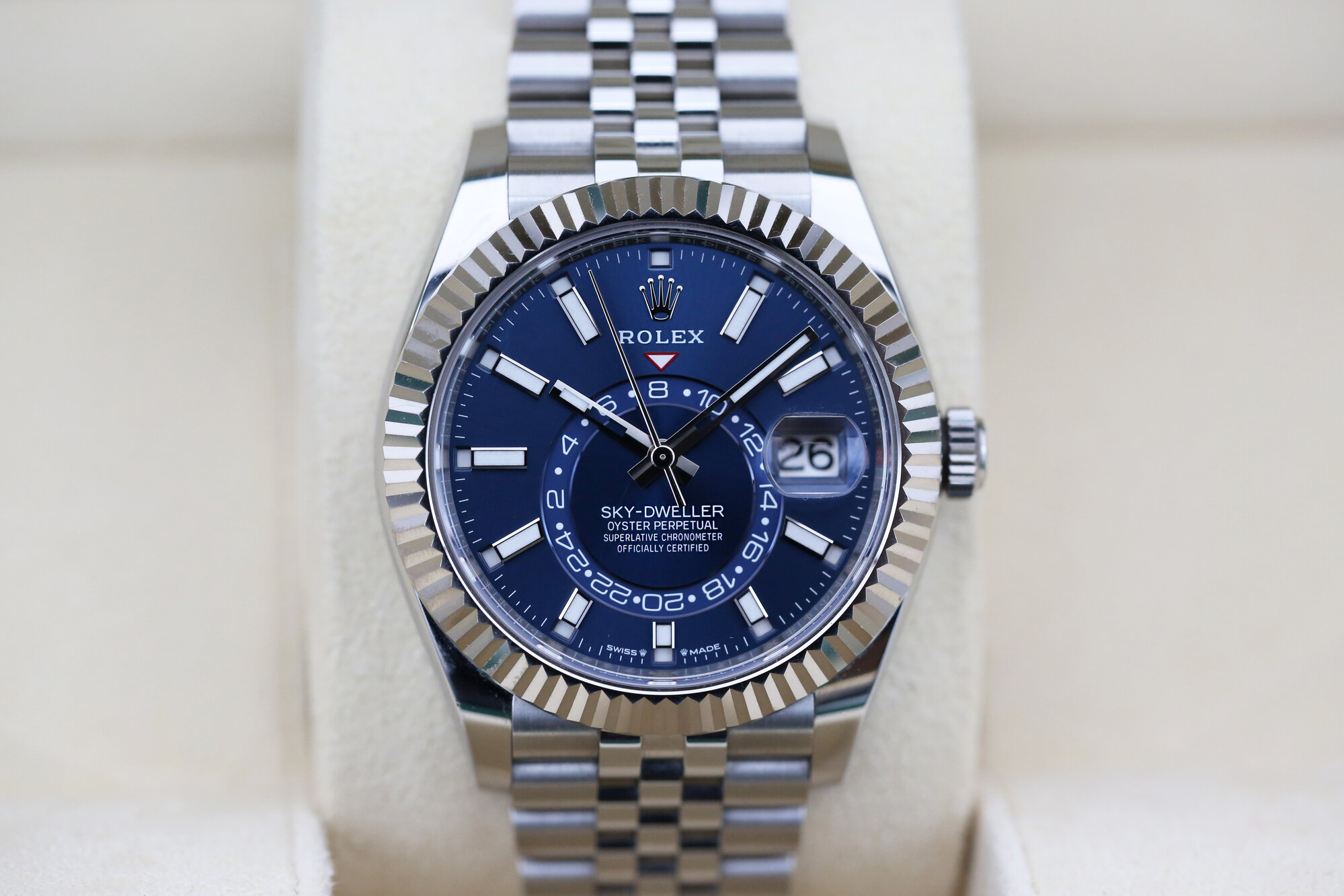 Here we have the Rolex Sky-Dweller– Blue This is a 42mm model and comes on the famous jubilee bracelet, it boasts a stunning blue dial and a 18ct white gold fluted bezel. The sky-dweller has a fixed inverted red triangle pointing to an off-centre 24-hour disc that allows a traveller... Read More